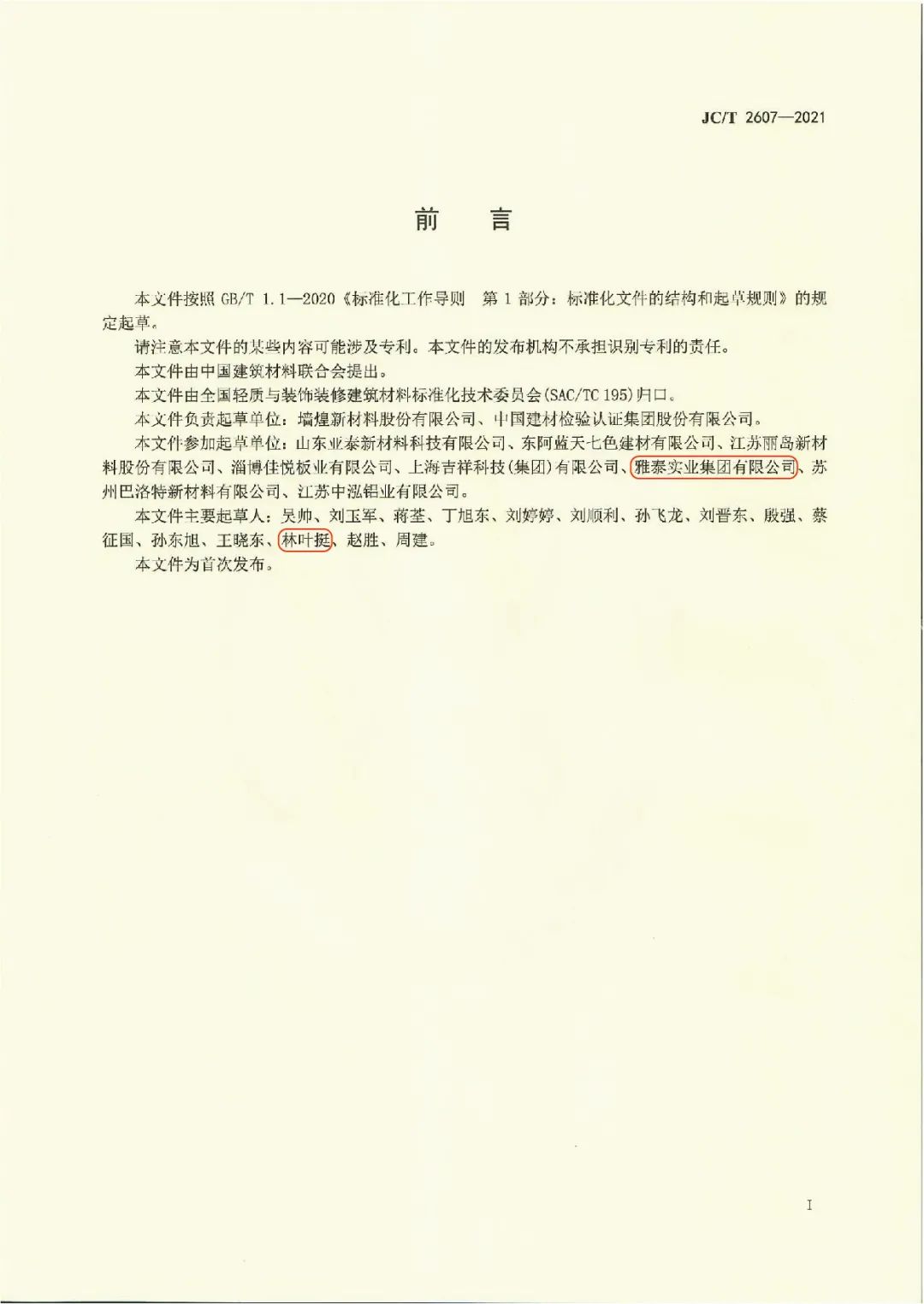 近日,由中國建筑材料聯(lián)合會(huì )提出,雅泰實(shí)業(yè)集團參與起草的《JC/T2605-2021建筑裝飾用氟碳覆膜金屬板》、《JC/T2607-2021建筑屋面用預輥涂金屬板》兩項行業(yè)標準于2021年3月5日發(fā)布,同年7月1日正式實(shí)施,公司技術(shù)部經(jīng)理林葉挺為此次兩項行業(yè)標準的主要起草人之一。